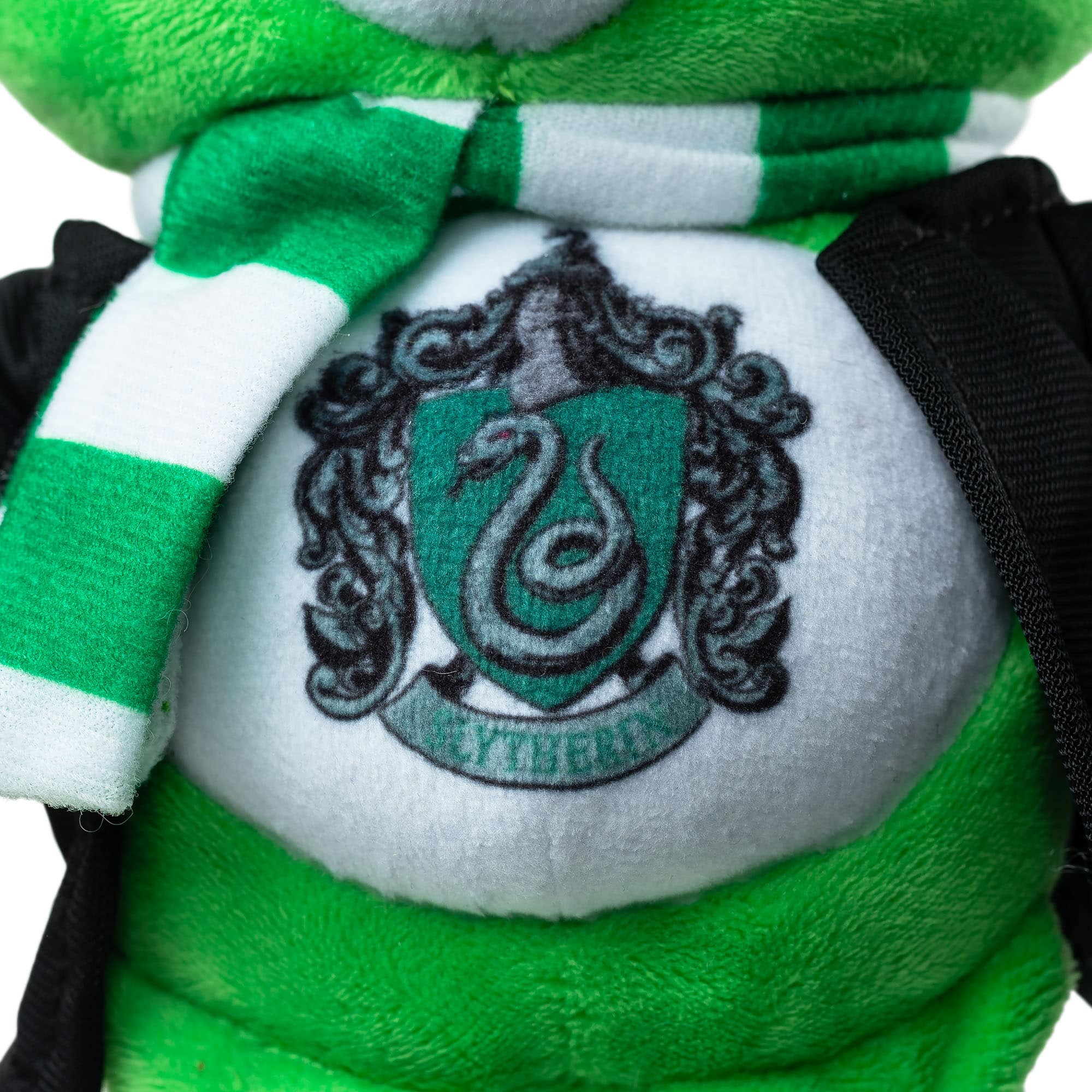 Delightful Details: Slytherin House Good Luck Bear 8-inch plush has a belly badge featuring the Slytherin House Crest. He also wears a House robe and scarf, and metallic ear details. His paws feature both Good Luck’s four leaf clover emblem as well as the Harry Potter 25th Anniversary logo.