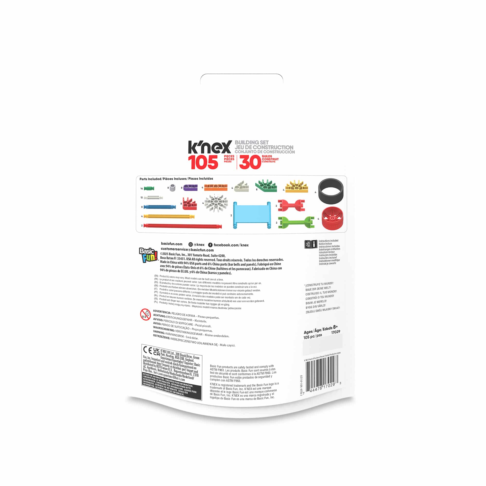 105 PIECES – This set comes with 105 classic K’NEX parts and pieces that “click” together, allowing kids to create anything that they can imagine. It includes rods and connectors that are attached to one another in different ways, allowing kids to unleash their creativity and skills in designing a variety of shapes, figures, and models. The snap-fit pieces stick together securely and can be easily reassembled into other creations.