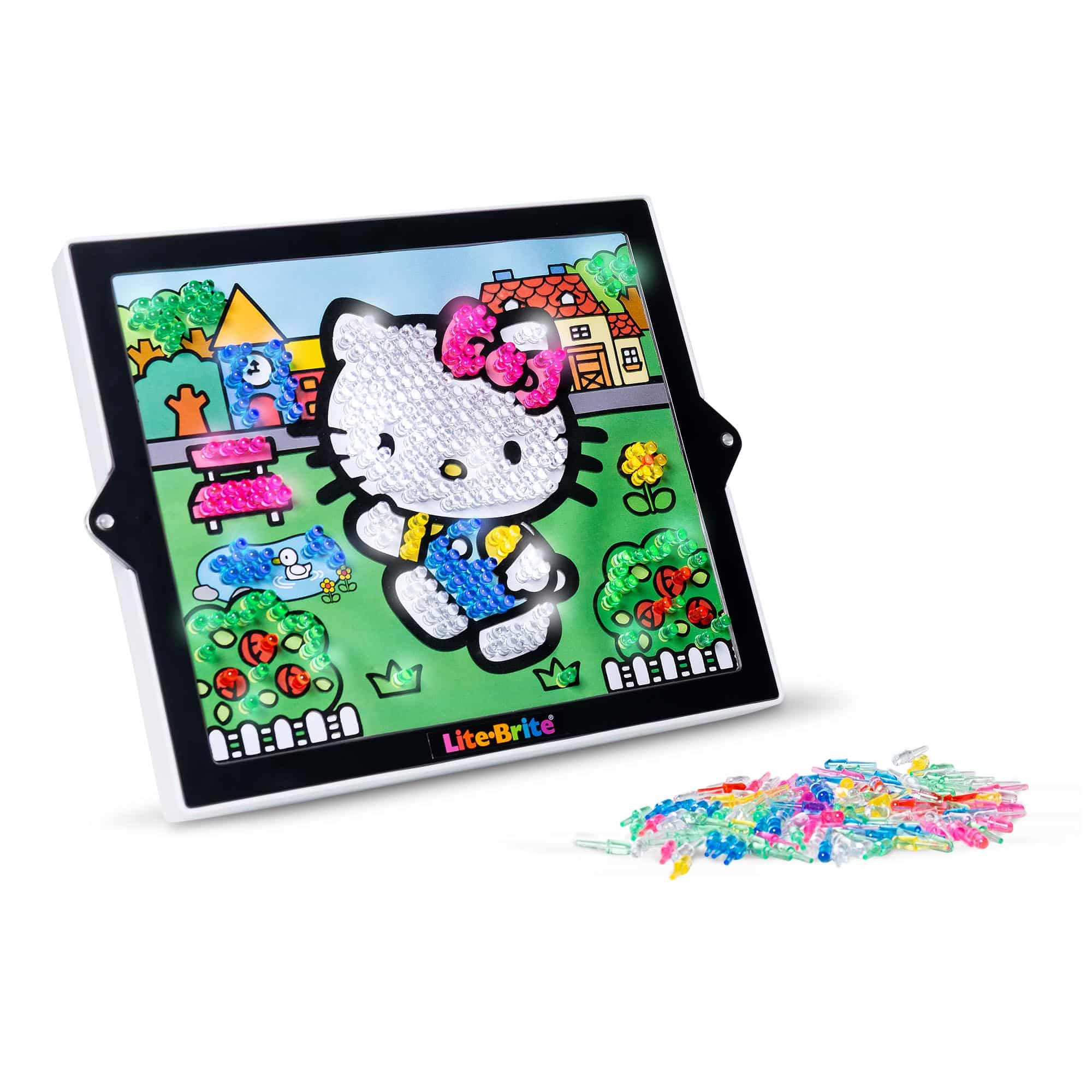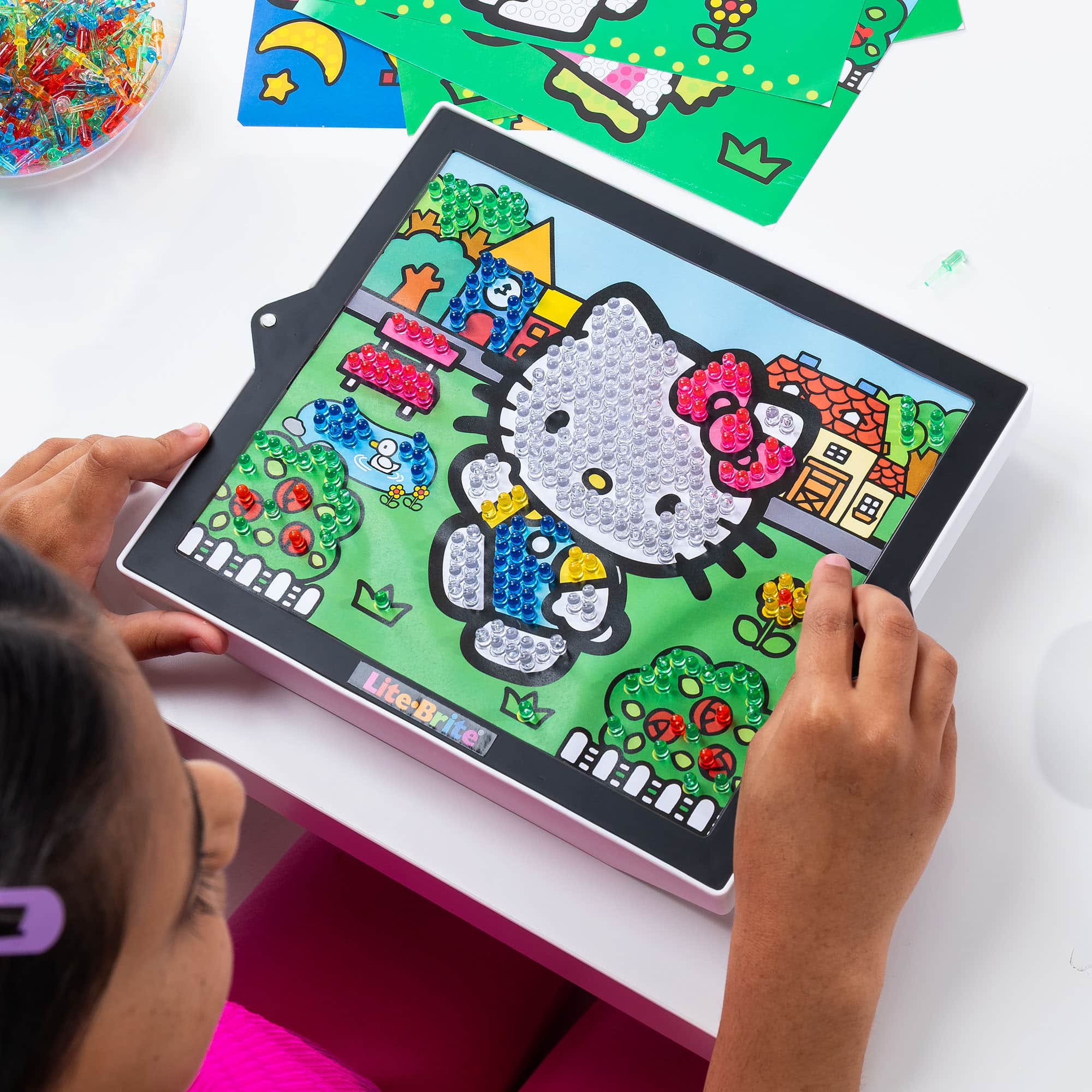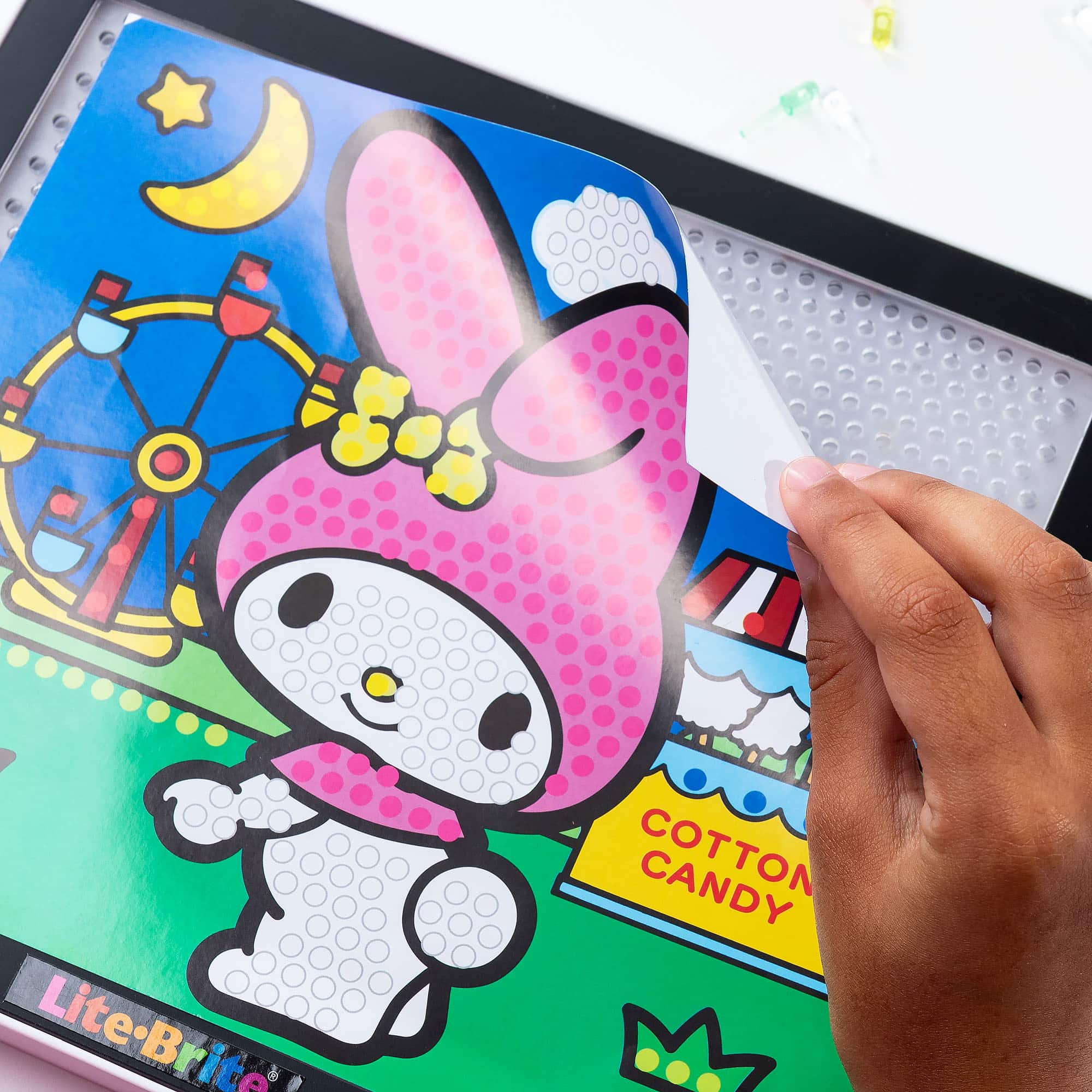 Say hello to the cutest glow ever with the Lite-Brite x Hello Kitty and Friends ColorPOP Edition! This adorable collab brings Hello Kitty and Friends to life with six ColorPOP templates—perfect for fans ages 6 and up. Choose from full-color templates like Hello Kitty strolling by the pond; My Melody ready for cotton candy and a ferris wheel ride; or Kuromi dreaming up a mischievous day in style. With 650 Mini-Pegs—specially designed to be smaller and slimmer—fans can create ultra-detailed art with light that truly POPs with color and precision. Scan the QR code on the package to download and print additional templates at home!. Plus, with a first-ever translucent HD screen, fans can enjoy a magical glow in every peg and vibrant scene—brought to life with four dynamic light modes: steady, bounce, flash, or clockwise. For convenience, the light automatically turns off after five minutes of inactivity, or you can hold the power button for five seconds to keep the glow shining continuously. Once your artwork is complete, display it proudly using the built-in pull-out easel—perfect for showcasing your glowing creations at home or wherever inspiration strikes!