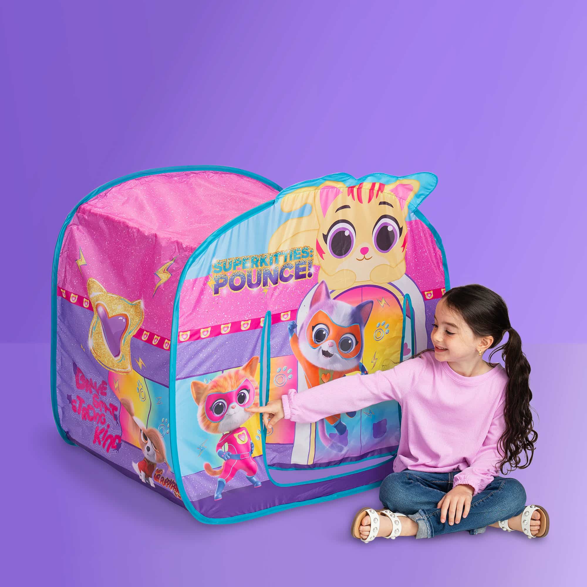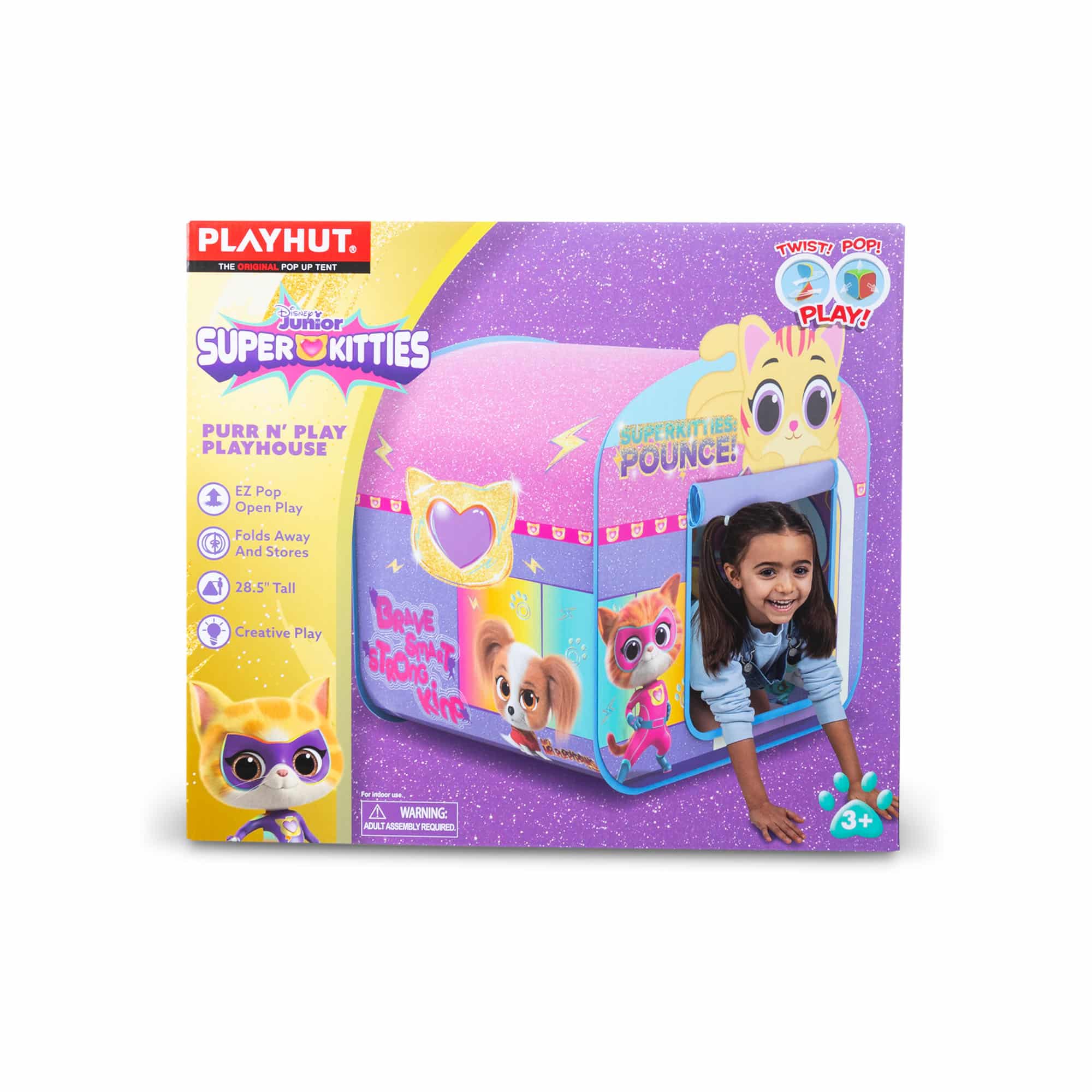 “Get ready to pounce into playtime with the Playhut SuperKitties Purr ‘N Play Playhouse! This one-of-a-kind tent is bursting with heroic energy and adorable style, featuring all your favorite feline superheroes in bold, colorful wraparound graphics. With its unique shape and premium taffeta material, this playhouse is as durable as it is delightful—perfect for nonstop adventures, cozy catnaps, or top-secret SuperKitty missions!